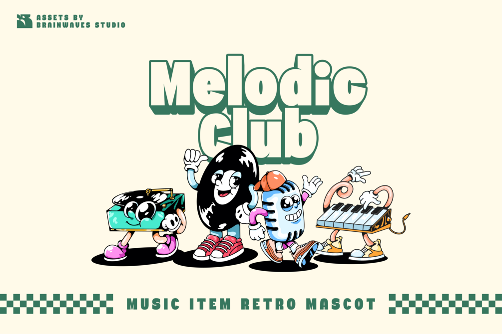 MUSICAL CLUB RETRO MASCOT It's an Illustration Assets with style Retro Mascot this Assets already designed with text, you can used its for any merchandise or design assets. its have 4 characters ready to used